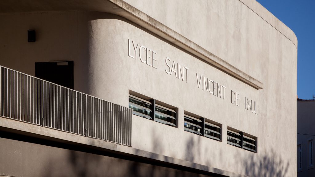 La forme particulière du bâtiment le distingue du reste du paysage urbain. C’est un bâtiment plutôt dense, mais aux multiples fonctions. En effet, l’antre du lycée réunit un restaurant, des cuisines, un gymnase et une grande cour intérieure, en plus des nombreuses salles de classe. La cour est d’ailleurs implantée sur un ancien parc boisé, ce qui lui apporte ce côté rafraîchissant à l’abri des platanes.