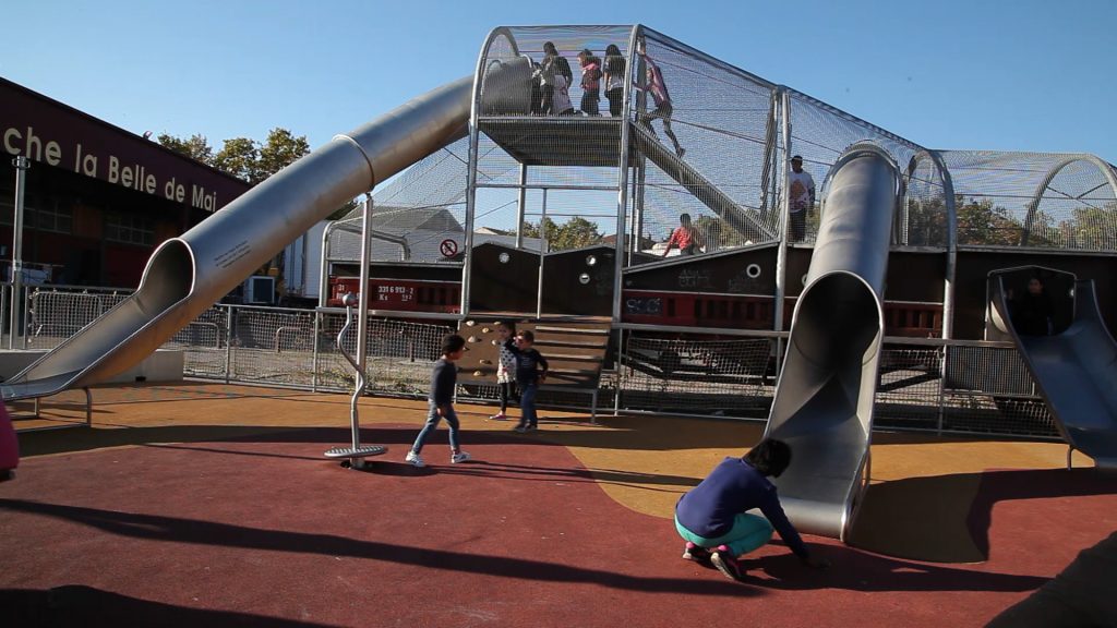 Lorsque je m’y rends, de nombreux enfants, accompagnés de leurs parents y jouent. C’est un lieu de rencontre qui a été installé sur une ancienne voie de chemin de fer. Le collectif Encore Heureux a pensé à réutiliser cette particularité : l’aire de jeux est aménagée autour du chassis d’un véritable wagon à marchandises ! L’univers qui se dégage ici est ainsi résolument ludique : c’est parti pour un voyage imaginaire depuis ce décor unique !